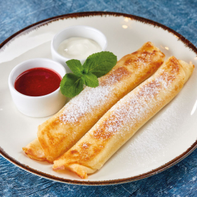 блинчики с начинкой из творога и сметаны, подаются со сметаной, мятой и клубничным соусом.